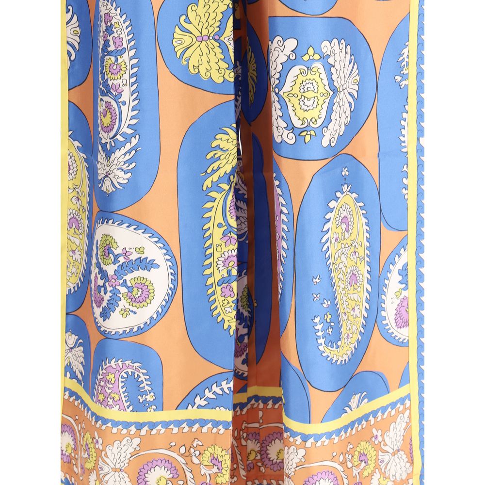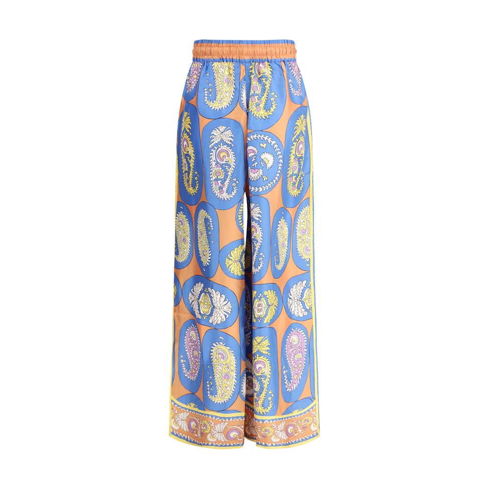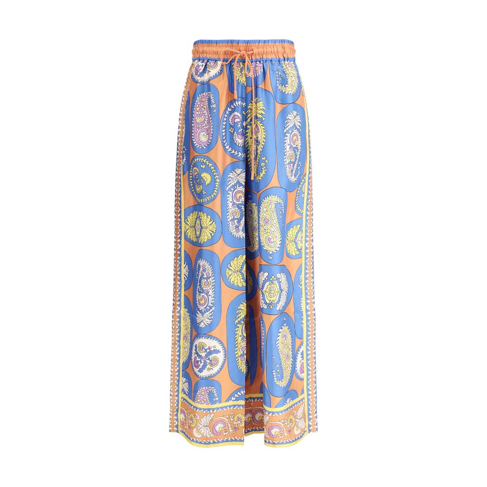 Silk Luis Pants by Alémais, wide-leg style, adjustable elastic waistband with drawstring, two side welt pockets, multicolored alla-over print, regular fit.