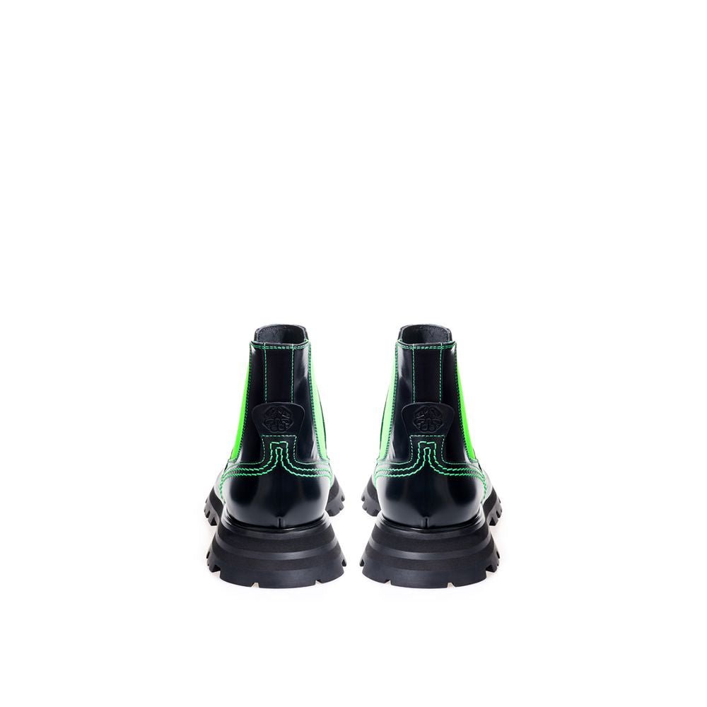 Alexander McQueen brushed leather Chelsea boots in black, neon green stitching, flared notched sole, layered heel. Back tongue with printed logo, elastic bands at sides in neon green. Composition: 100% Leather-Sku inside:23AP98-99
