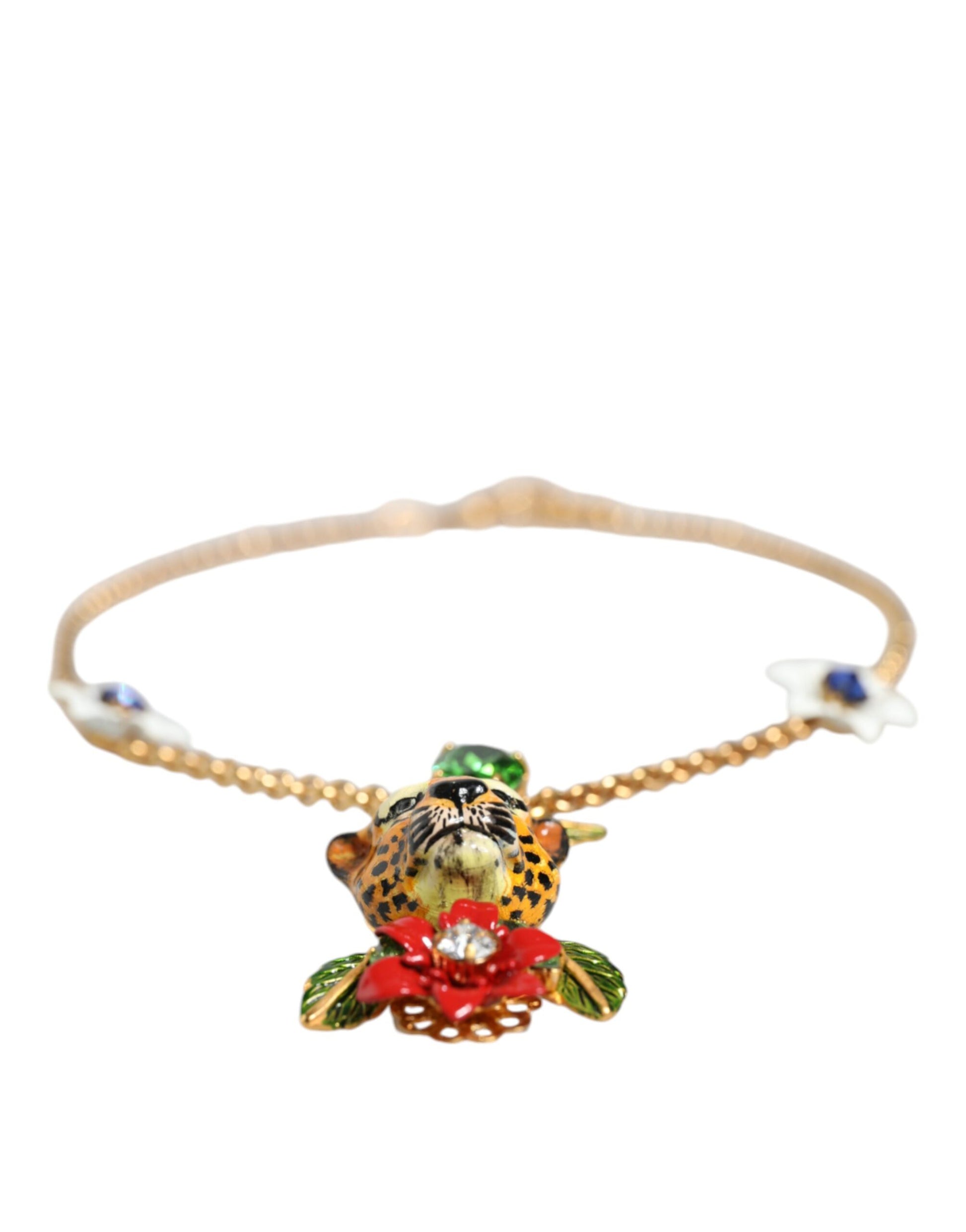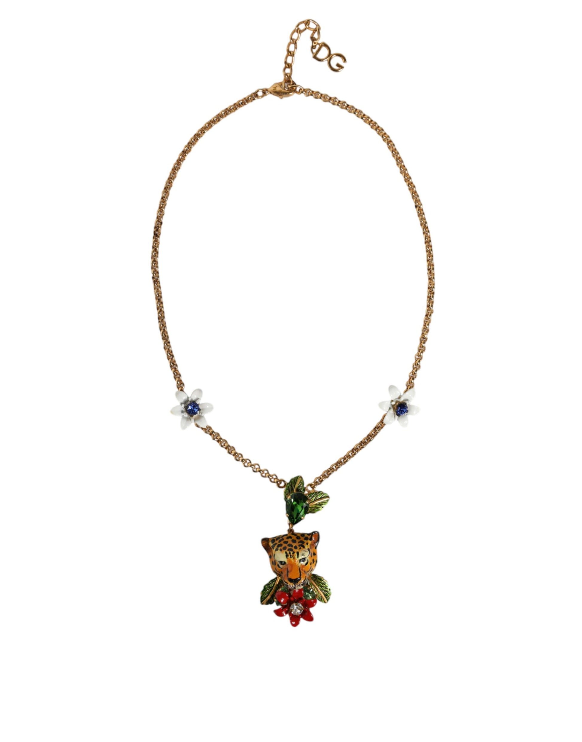 Dolce & Gabbana Gold Brass Leopard Flower Embellished Statement Necklace