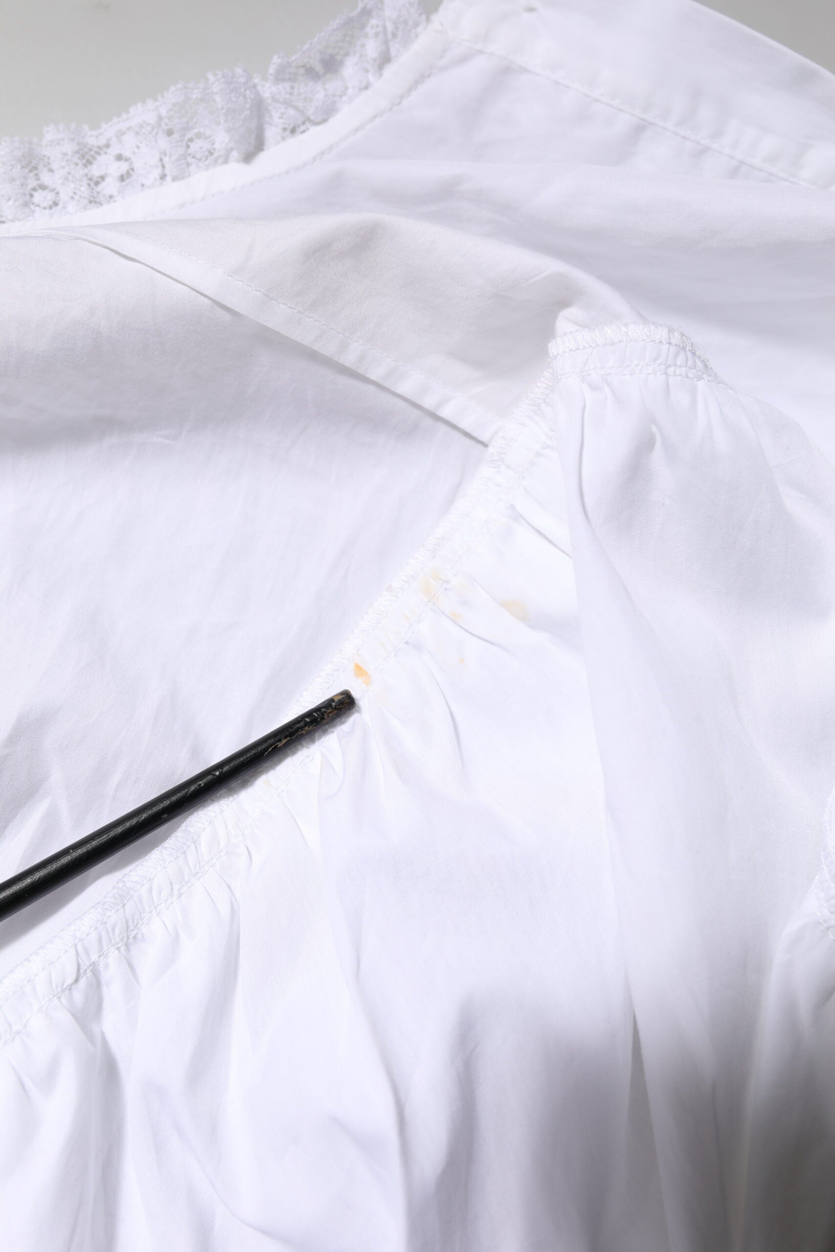 This item has a minor defect, there are stains on the front inside part of the blouse (see pictures for details).