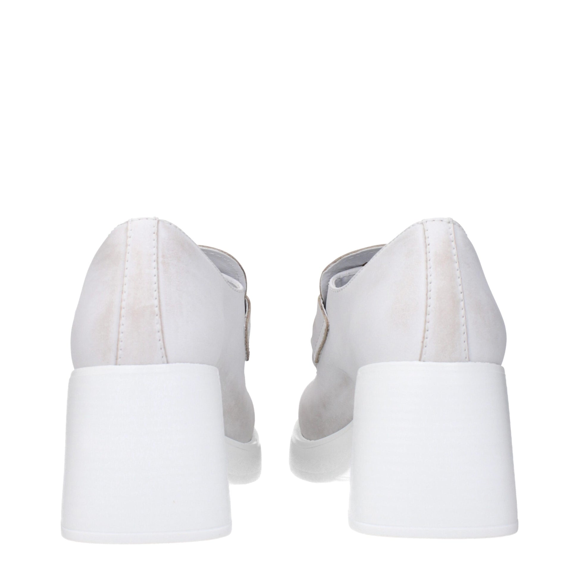The product with MPN 5D820D3G4875F0009 and code F83849 leather in white is a pumps designed by Miu Miu. It has features like front logo, intentionally distressed areas may vary, intentionally spotted areas may vary, intentionally discolored areas.