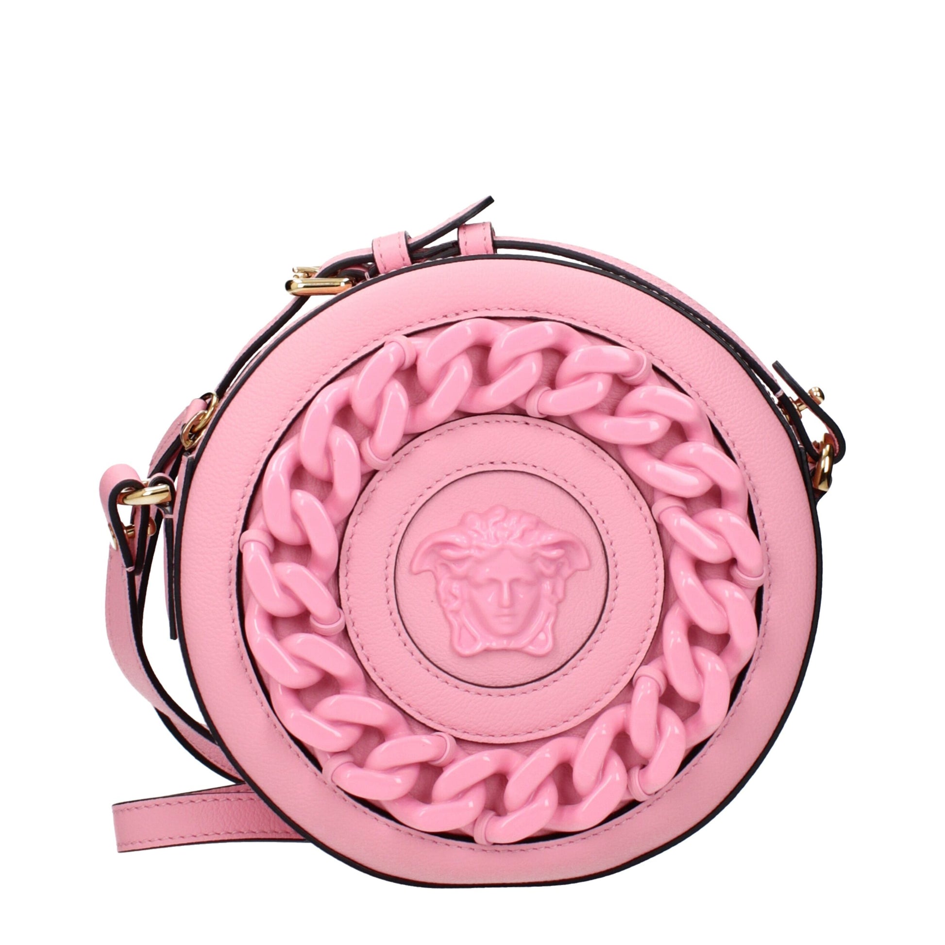 The product with MPN 10216021A159581P65V and code F84029 leather in pink is a crossbody bags designed by Versace. It has features like front detail, adjustable shoulder, removable shoulder.
